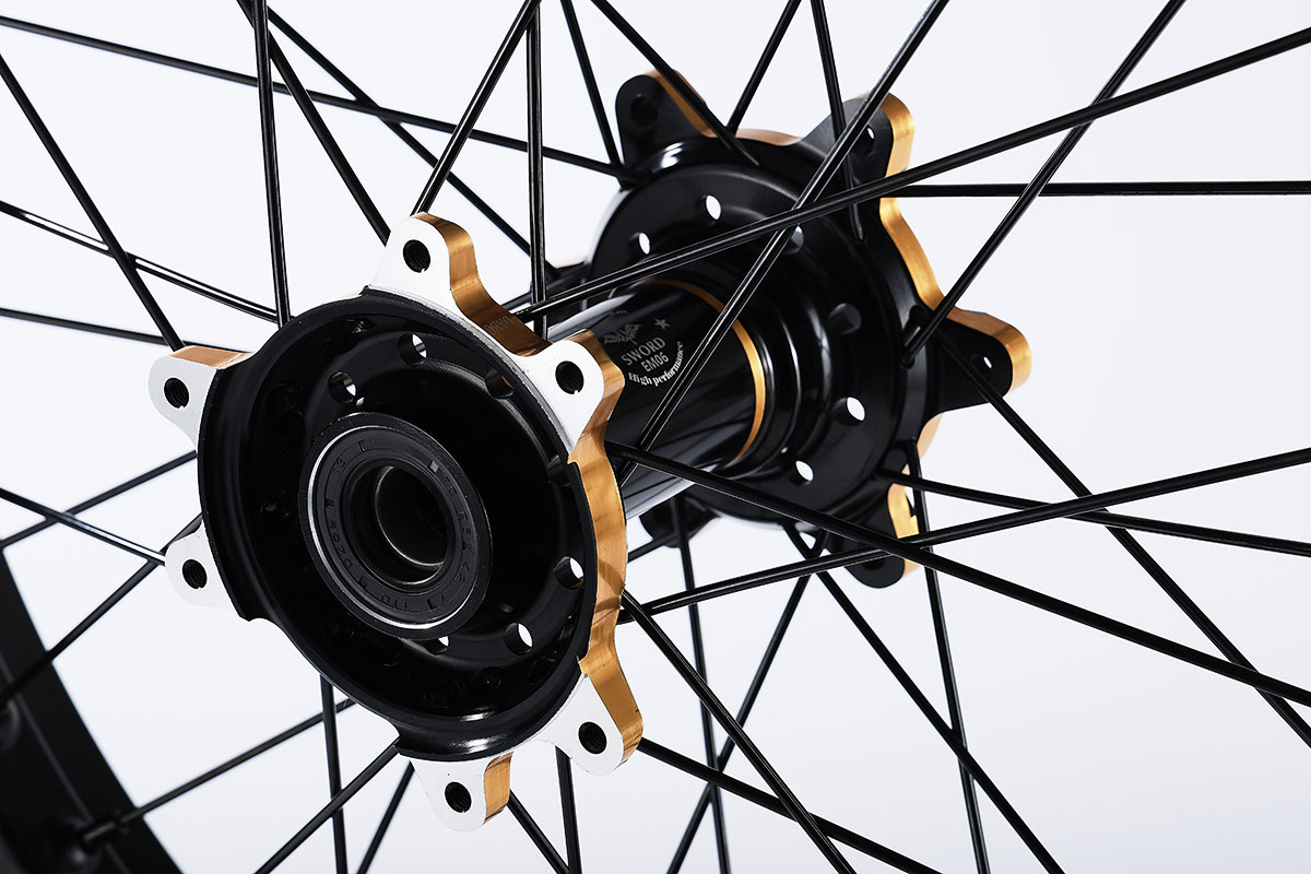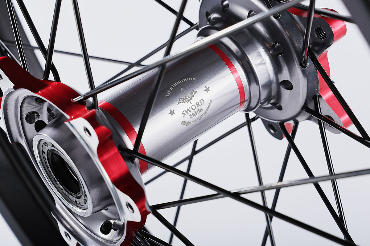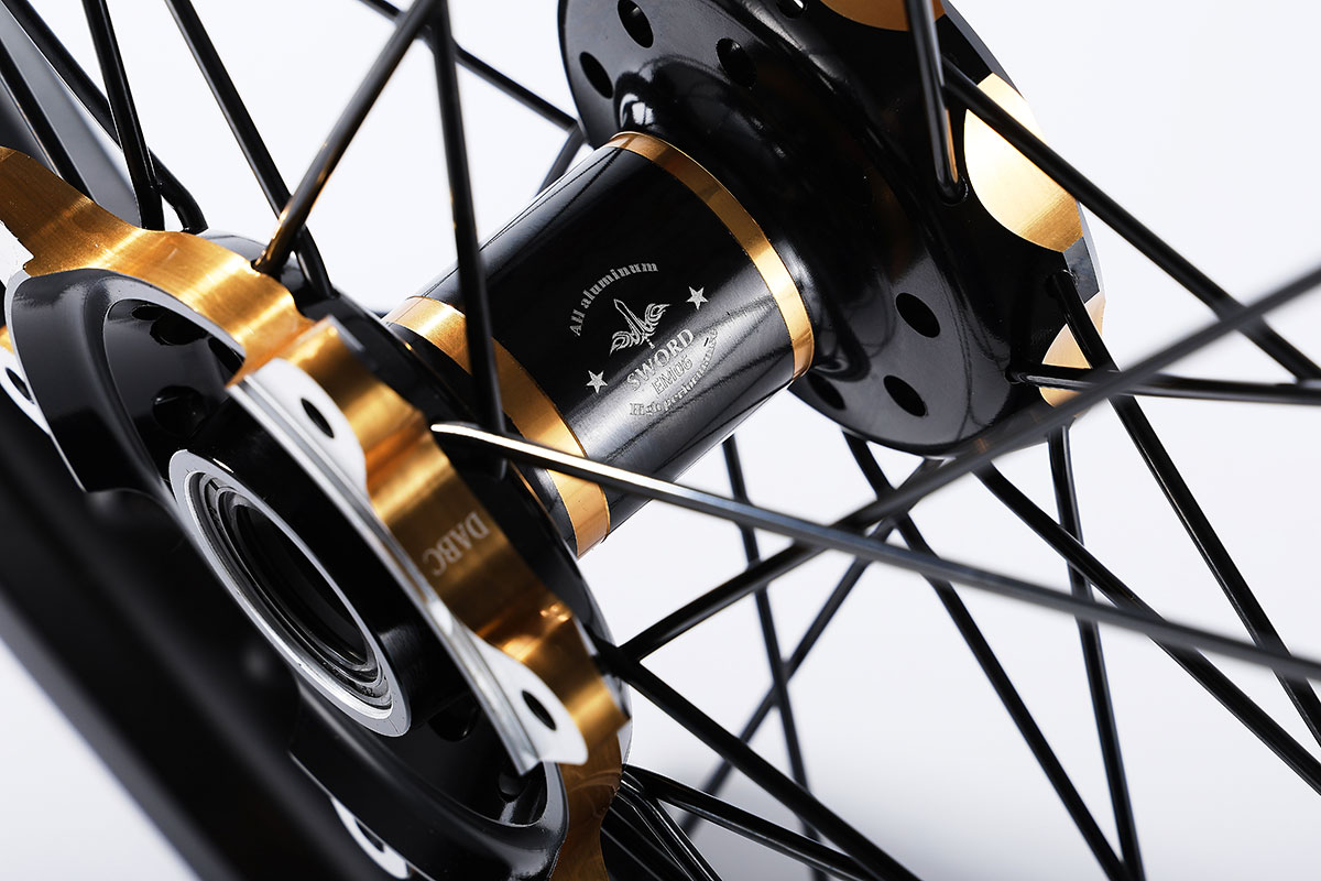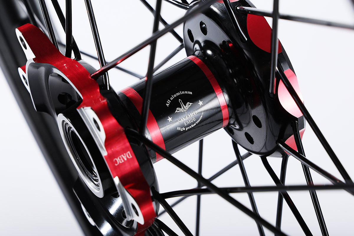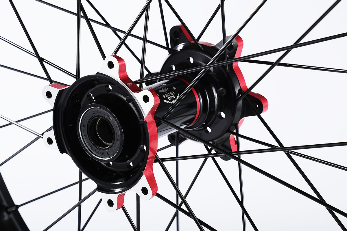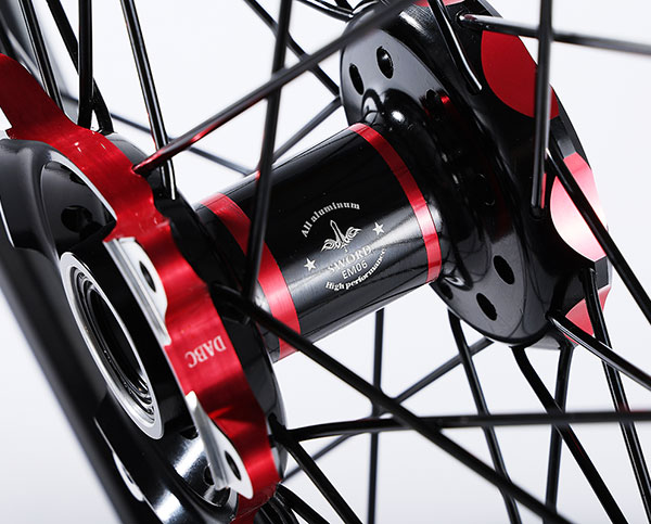 材质:7116AL T6,前轮:19*2.15" / 后轮:18*2.5",高强度铝制轮圈(黑金/黑红/钛红)